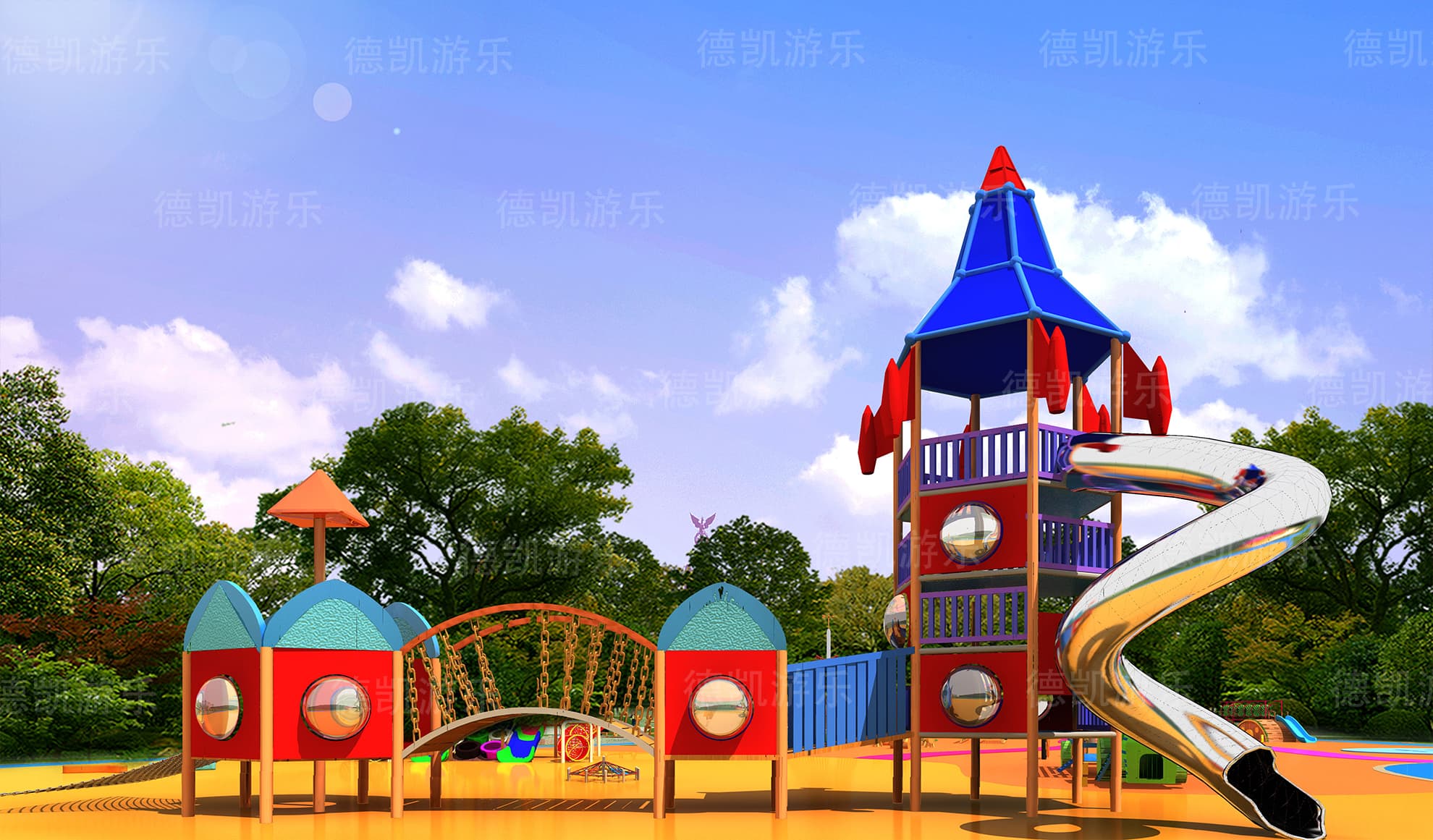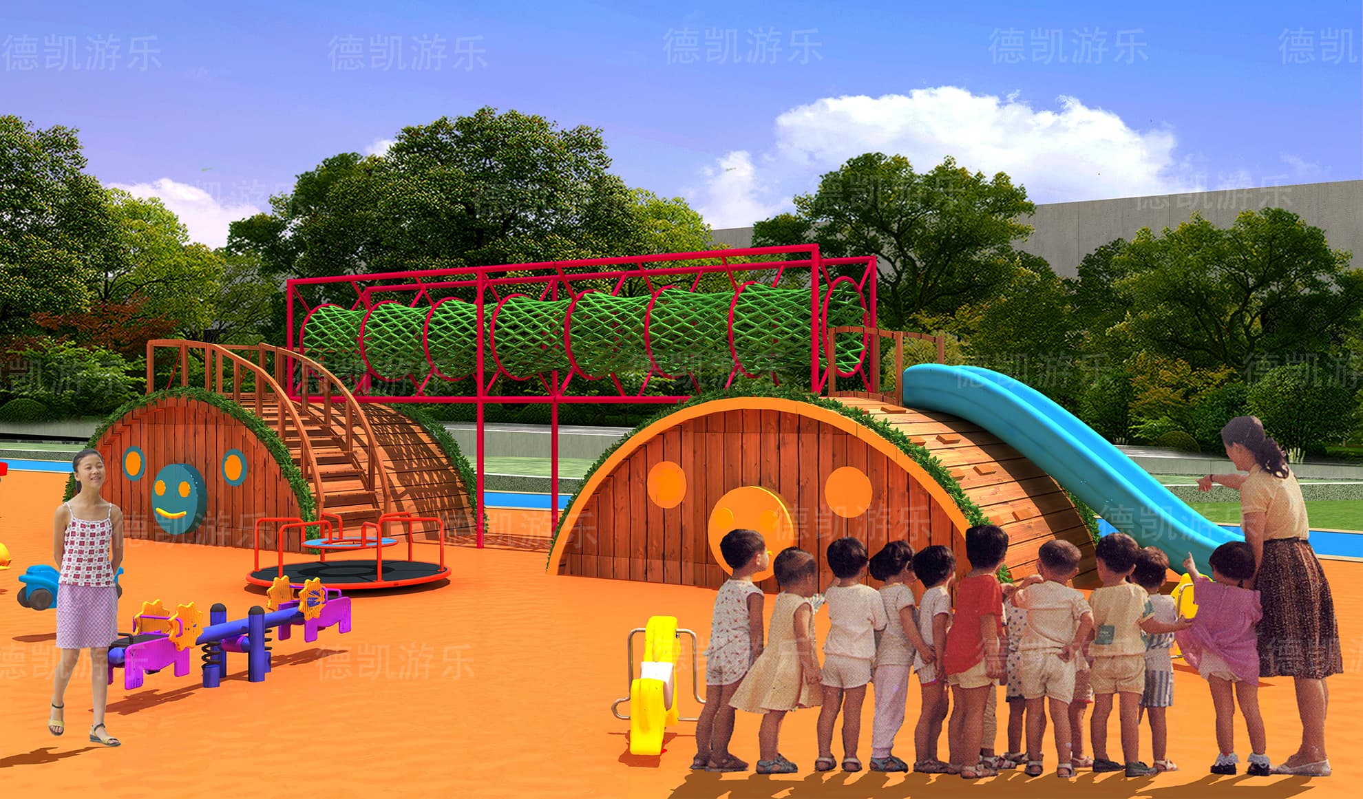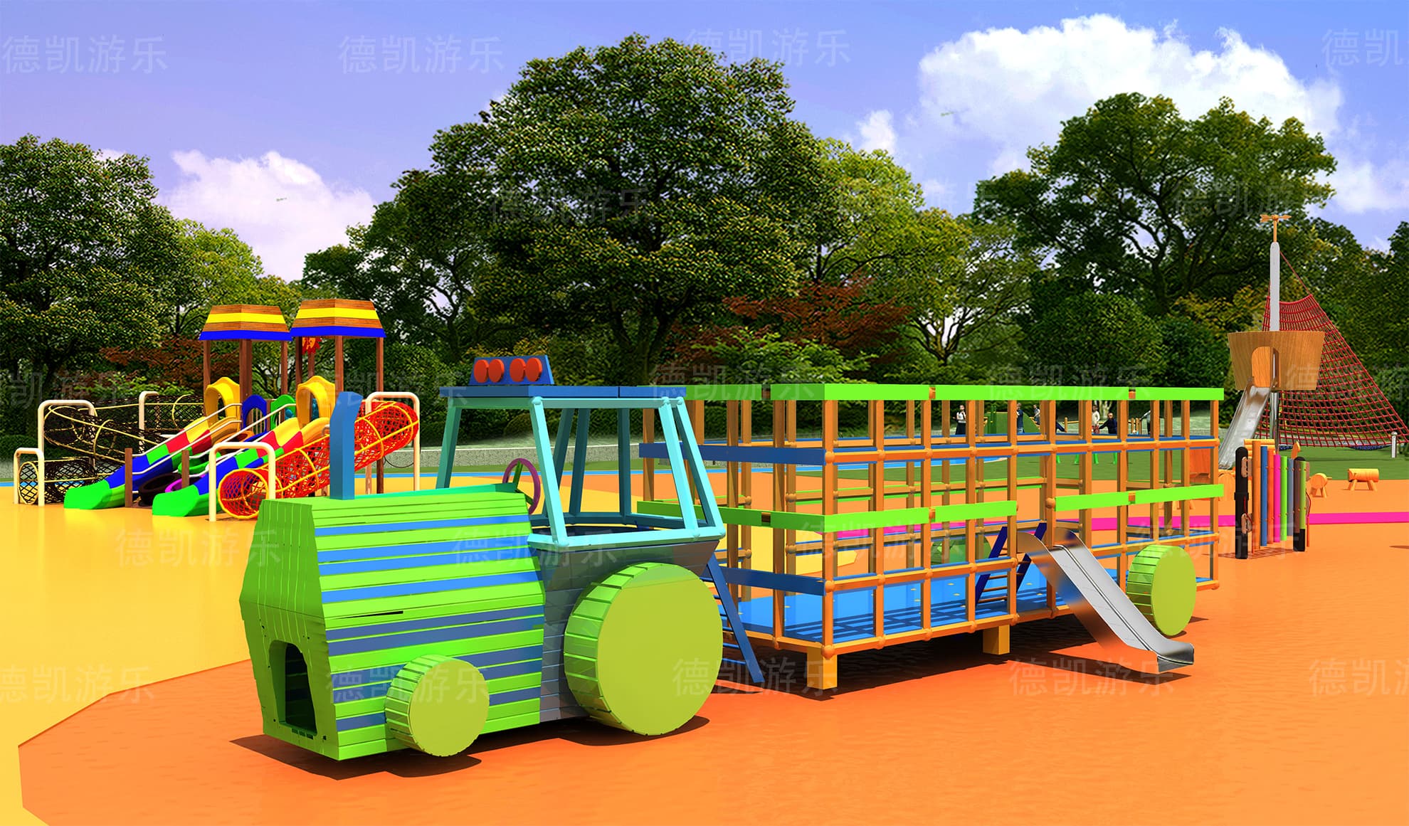 項目的主要規劃,場景的布置,設備的類型,設備的擺放以及整體場景的搭配,都在整體效果圖里面得到了體現。在效果圖之中,我們看見了沙池、攀巖組合和攀爬釘、攀爬桿、攀爬網、沙馳滑梯,還有沙池里面的挖沙機、小拓展、主體的滑梯、鉆網,小火車滑梯組合、鉆網滑梯組合、拓展群組合、打擊樂器組合、旋轉秋千、蹦床、蹺蹺板、轉椅。